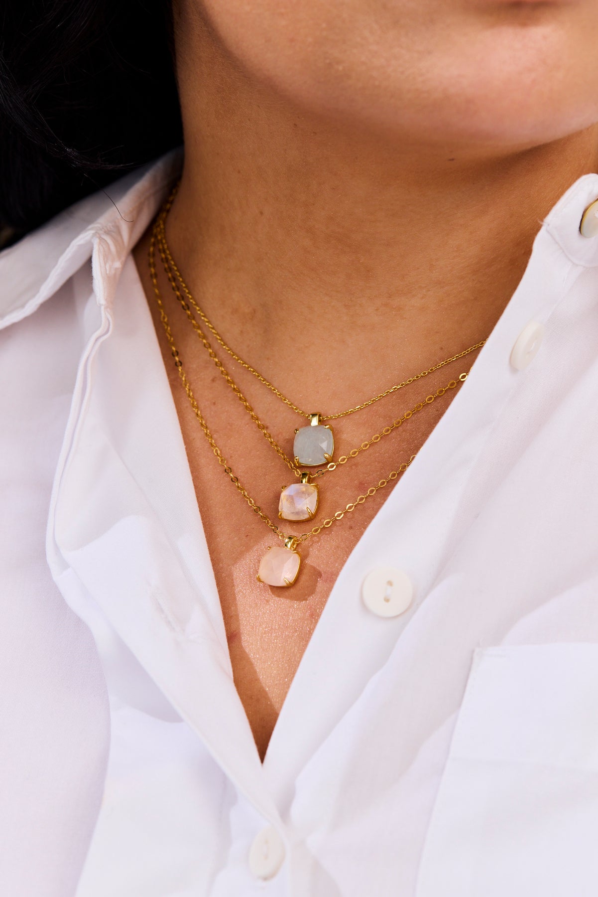 All our gemstones and crystals are in a cushion setting, on a sterling silver, gold plated chain.